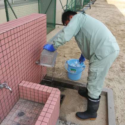 7月21日(木)、本校の2人の管理作業員さんにより週1回、配膳室から出る廃油処理をされている様子です。毎週やらないと油が腐ったり固まったりして掃除が大変になります。