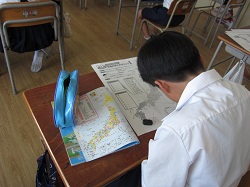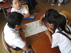 4年生が一生懸命、都道府県名を覚えています。1回の学習で、47個の都道府県の名前と位置を覚えるのは子どもたちにとっては難しいことです。何度も何度も繰り返すことが大事です。子どもたちも、プリントに都道府県名を書き込んだり、友だちと都道府県すごろくをしたりしながら、楽しく活動していました。