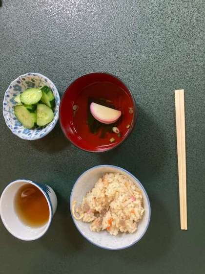 1日目の昼食は炊き込みご飯です。林間学習最初のいただきますです。