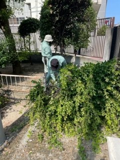 夏季休業中、本校の管理作業員さんが他校の管理作業員さんと協力して、樹木の伐採をしてくれました。真夏日の、焦げ付くような日差しの中、汗びっしょりになりながら、作業に励んでいただきました。