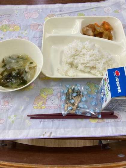 今日の献立は、ごはん、酢豚、中華スープ、アーモンドフィッシュ、発酵乳、牛乳です。