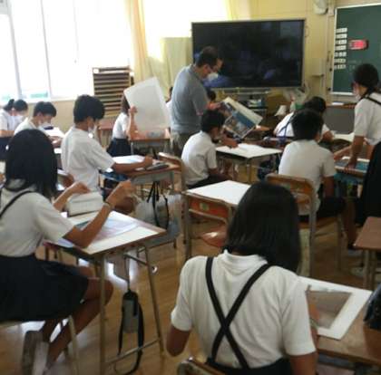 9月5日(月)、6年の授業で、各自でタブレットを使って撮影したものをプリントし、それを見て画用紙に描く作業をしていました。