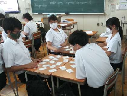 9月6日(火)、8年生の英語の授業の一コマです。英単語のカードでゲームを行います。ルールとして単語を発音して、反対語を選びます。