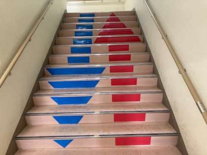 小学校校舎階段の表示が新しくなりました。この表示は、右側通行の徹底と事故防止のために以前からありましたが、少し古くなっていました。