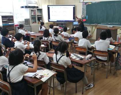 9月8日(木)、4年生の音楽の授業で、教室で、ソプラノリコーダーを手に持ち、大きな画面に写された楽譜を見て、みんなで演奏していました。