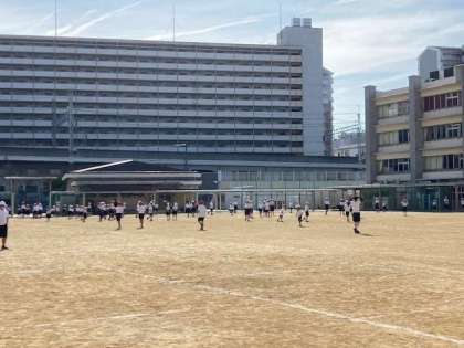 9月15日、小学校児童集会の様子です。今日は「増えオニ」というゲームを児童全員で行いました。これは、オニからタッチされた子供もオニになり、どんどんオニが増えていくゲームです。ゲームの最初はほとんど白帽だったのが、最後には赤帽を被ったオニに変わっていました。