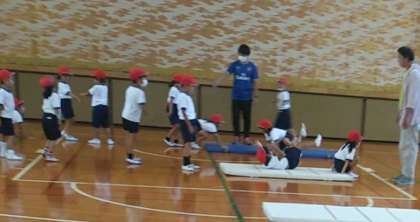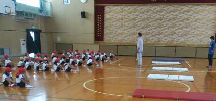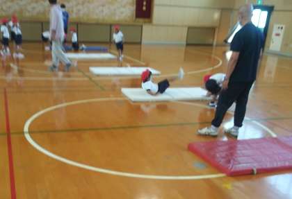 9月16日(金)、1年生が、体育館で先生方の指導をよく聞き、マット運動で、前回りを上手にしていました。