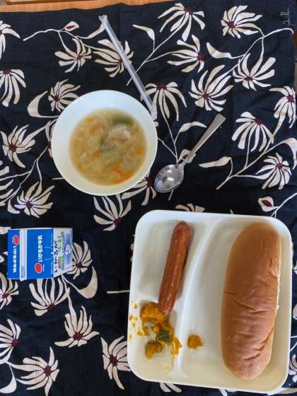 今日の献立は、黒糖パン、ウインナーのケチャップソース、スープ、焼きかぼちゃ、牛乳です。
