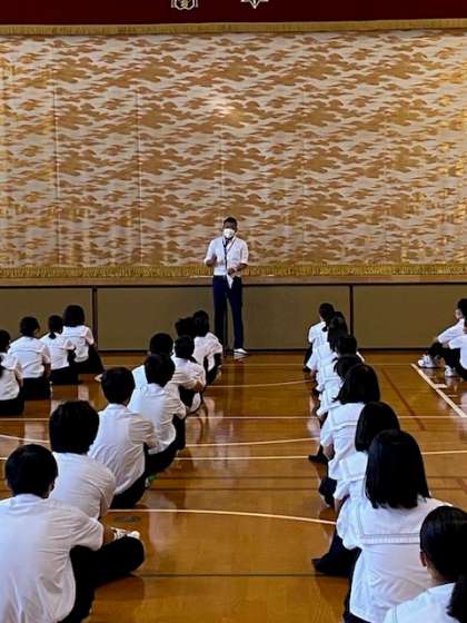中学生に対して、日頃の部活動での活躍、また部活に参加している小学校5・6年生をリードしてくれることに対して感謝と励ましの話がありました。その後、部活動を引退などで締めくくり、これから進路選択へのチャレンジが続いていく9年生、続く8年生、7年生にむけて『勉強』に関する話がありました。