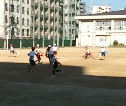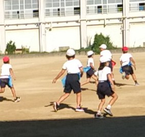 9月26日(月)、4年生の体育の授業内で、2つ目に、腰に紐状のものを巻き2枚のフラッグを付けて取り合うゲームをしていました。