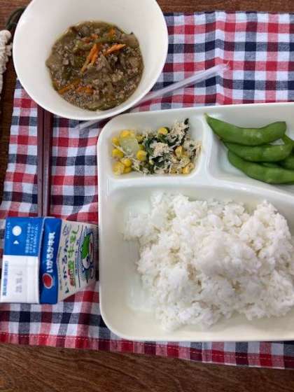 今日の献立は、ごはん、マーボなす、チンゲンサイとコーンのいためもの、えだまめ、牛乳です。