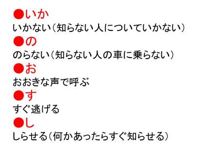 ついて行かない、車に乗らない、大声を出す、すぐ逃げる、知らせる ですね。