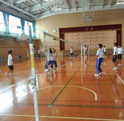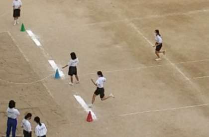10月3日(月)、9年生の体育の授業です。男子は、体育館で、バレーボールをしていました。女子は、運動場にて、走り幅跳びをしていました。