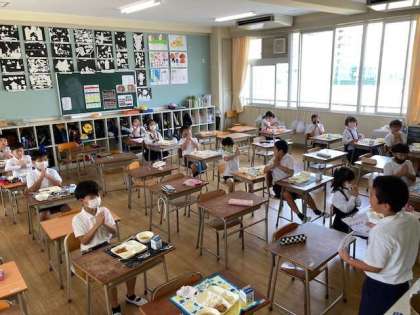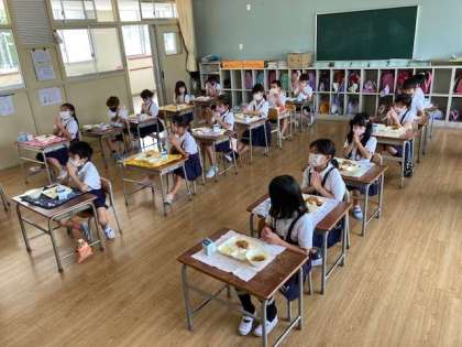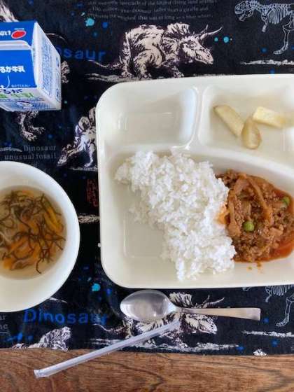 今日の献立は、タコライス、もずくのスープ、焼きじゃが、牛乳です。