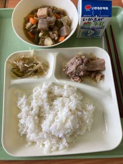 今日の献立は、ごはん、豚肉のねぎ醤油焼き、ふきよせ煮、きゅうりともやしの甘酢和え、牛乳です。