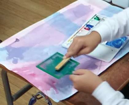 10月7日(金)、3年2組で、ローラーを転がした上にスパータリングを行って模様を付けていました。