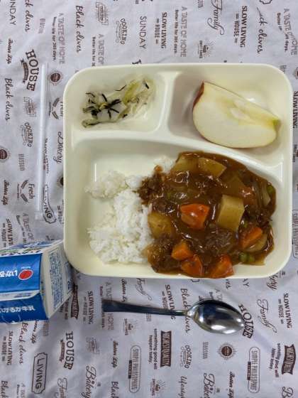 今日の献立は、ハヤシライス(米粉)、キャベツのひじき、ドレッシング、りんご、牛乳です。