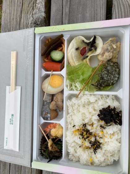 菅島に着いて、最初はお弁当です。魚や貝をはじめ、菅島産の食材を使ったお弁当です。