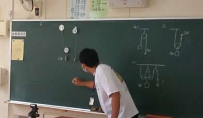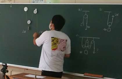 10月21日(金)、9年1組の教室にて、理科の授業である、滑車のオンライン授業をしていました。