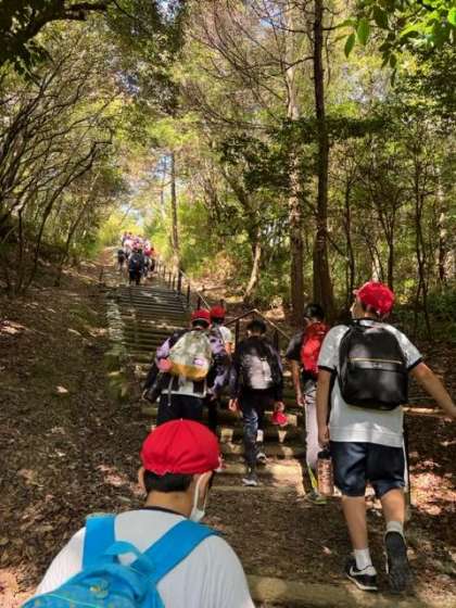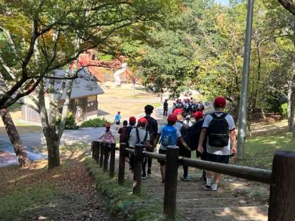 急な道をのぼりおりしながら、やんちゃの里に到着しました。今から遊具で遊びます。