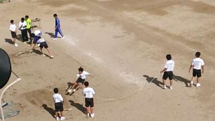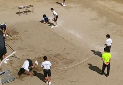 10月25日(火)、8年生男子の体育は、運動場の砂場で行われていました。学年が上がるごとに跳躍力も伸びていることでしょう。