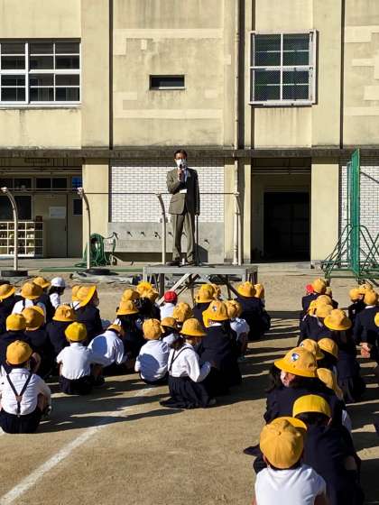 10月31日(月)、運動場で小学校全校朝会が行われました。