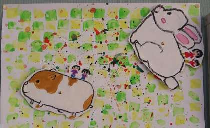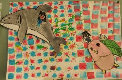 11月4日(金)、3年生の児童作品です。どの作品も白の画用紙にカラフルな色彩上に動物や乗り物を形どったものをピン止めしてくるくると回る仕組みになっています。