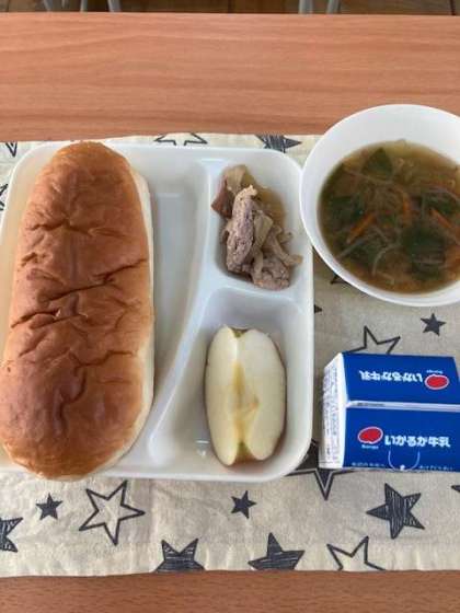 今日の献立は、おさつパン、豚肉のオイスターソース焼き、中華みそスープ、りんご、牛乳です。