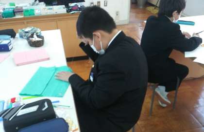 11月7日(月)、7年1組の半分は、被服室にて、コーディネート(服の組み合わせ)と衣服のT.P.O(時・場所・場合)を考えていました。今後どんなものができるかが楽しみです。