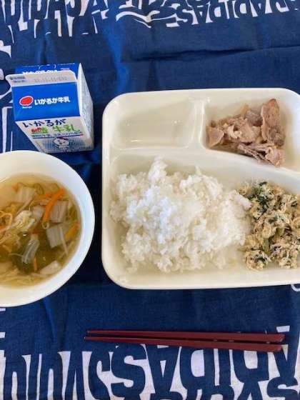今日の献立は、ごはん、豚肉のスタミナ焼き、すまし汁、とりなっ葉いため、牛乳です。