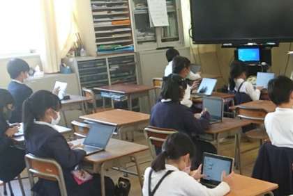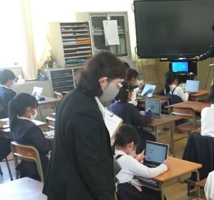 11月9日(水)、2年生の教室にて、タブレットを使って、画面に指で、ひらがなを書いて漢字に変換する学習や、円グラフの学習をしていました。