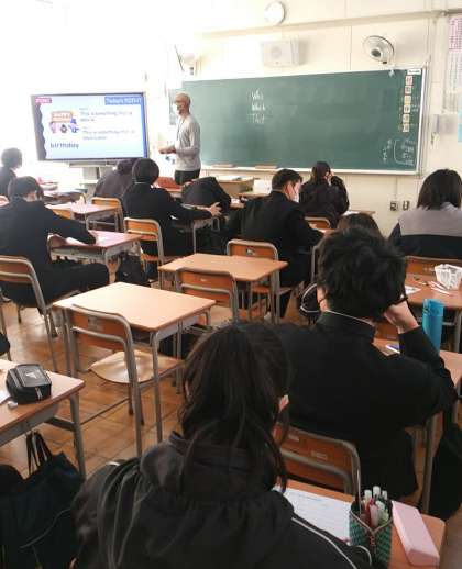 11月10日(木)、9年2組英語の授業です。C-NETの先生から英語で質問され、生徒たちも英語で答えていました。