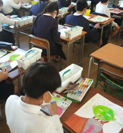 11月11日(金)、5年生の図画工作の授業です。有名作品を見て、各自でアレンジした下絵に色を塗っていました。出来上がりが楽しみです。