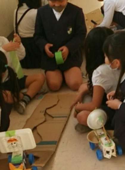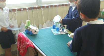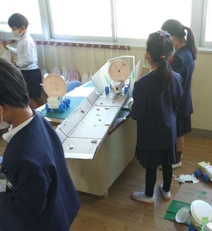 11月16日(水)、2年生が、先日より牛乳パックに車輪部分としてストローに竹ひごを通し、風受け用にプラ皿を取り付けて手作り車を作っていました。今日は、グループで段ボールを使って道作りをしていました。
