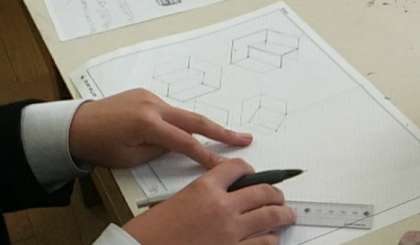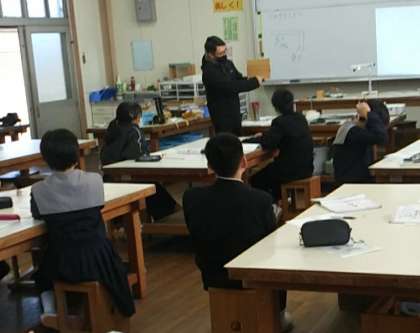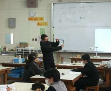 11月18日(金)、技術室にて、7年2組の半分の生徒は、図画に等角図を書いていました。次回から差し金を使って作業を行うため部位名(長手、妻手)や持ち方、使い方の説明がありました。