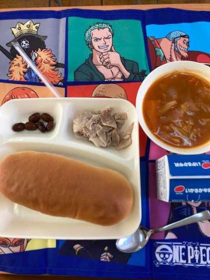 献立はコッペパン、バター、豚肉のガーリック焼き、ケチャップ煮、うずら豆のグラッセ、牛乳です。