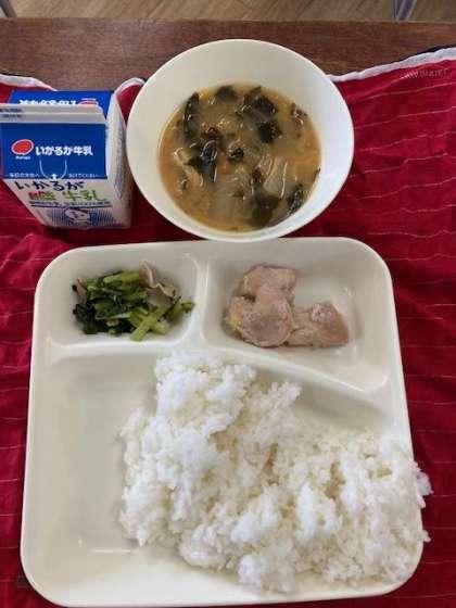 今日の献立は、ごはん、鶏肉のおろしじょうゆかけ、みそ汁、こまつなのいためもの、牛乳です。