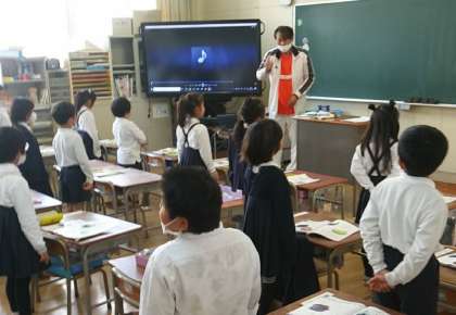 11月24日(木)、1年1組で、みんなで歌を歌って、その後、一人ずつ前で歌っていました。