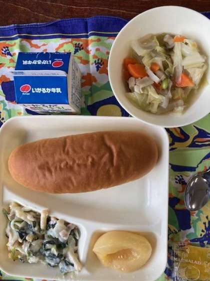 今日の献立は、コッペパン、マーマレード、ほうれんそうのグラタン、スープ煮、白桃の缶詰、牛乳です。