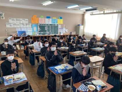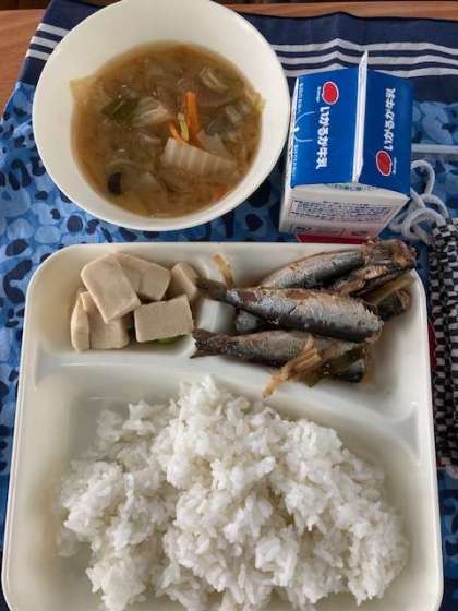 今日の献立は、ごはん、いわしの生姜煮、みそ汁、高野どうふの煮物、焼きのり、牛乳です。