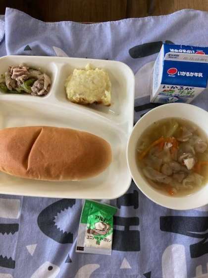 今日の献立は、コッペパン、ソフトマーガリン、豚肉と野菜のソテー、スープ、スイートポテト、牛乳です。
