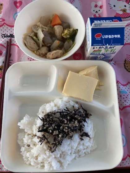 今日の献立は、ごはん、卵どうふ、一口がんもと野菜の煮物、魚ひじきそぼろ、牛乳です。