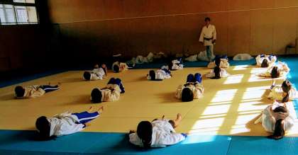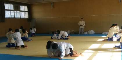 12月12日(月)、8年女子は、格技室にて、柔道の授業をしていました。受け身の復習や頭を守る姿勢、立ち位置からの受け身をこなして、二人一組が背中合わせになりそこからの寝技に持ち込む技の練習をしていました。