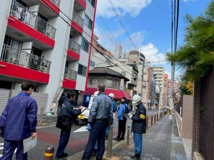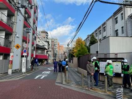 西成区役所、西成警察署、大阪市建設局、萩之茶屋地域周辺まちづくり合同会社の方々、学校が参加し、危ないところはないか、また、改善事項などを確認していきました。