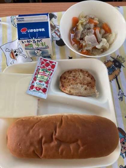 今日の献立は、黒糖パン、豆腐ハンバーグ、カリフラワーのスープ煮、スライスチーズ、牛乳です。
