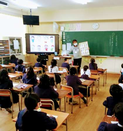 12月21日(水)、2年生の教室にて、『いただきます』という題材で、だれに『ありがとう』といいますか、という問いかけをしていました。児童からは、お母さんや給食を作ってくれている人などの答えがありました。いろんなお話しを聞きました。