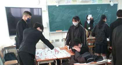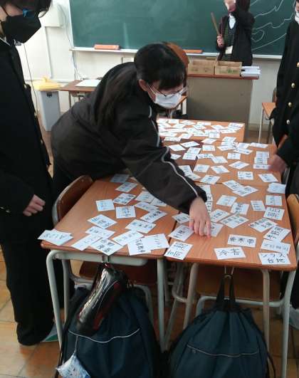 12月22日(木)、8年1組にて、社会科で学習した内容の手作りカルタを机に並べて、グループ内で、札を取り合っていました。
