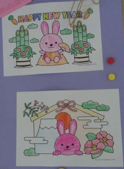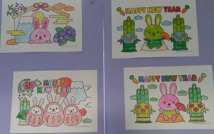 1月11日(水)、西館1階廊下に飾られています。色とりどりの児童作品です。