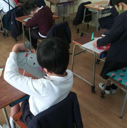 1月11日(水)、3年2組では、ウサギさんに色付けして、各自で、願い事をお札に書いていました。