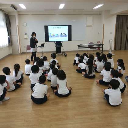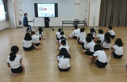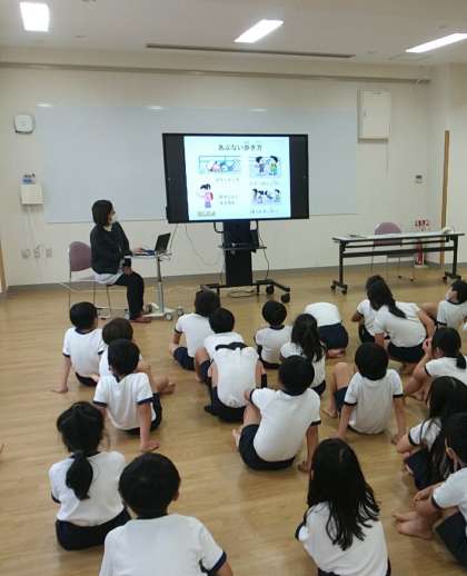 1月13日(金)、1・2・3年生は、交流ホールでの発育二測定後、学校内外の注意事項について、小学校の保健室の先生からお話しがありました。